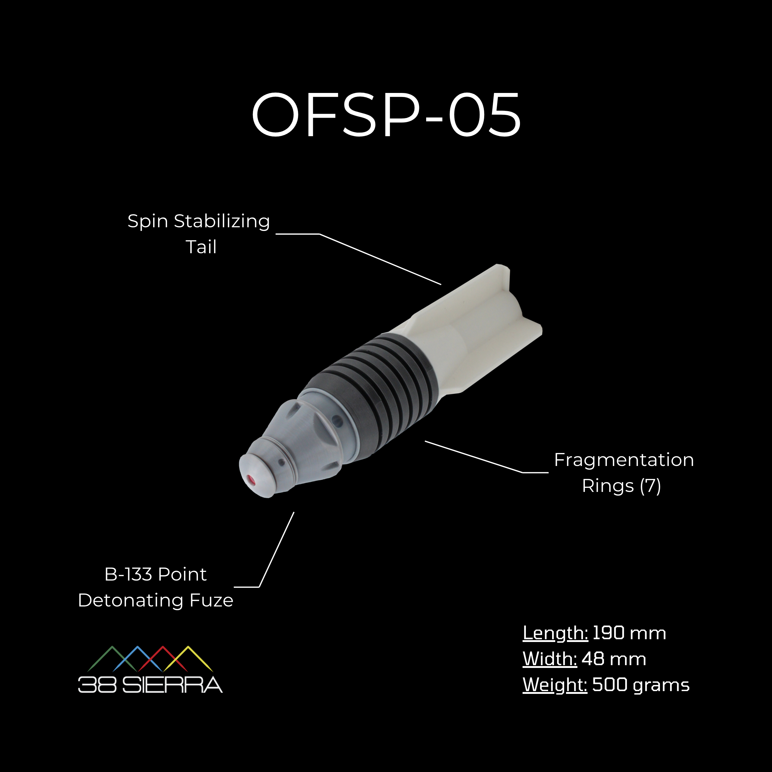 The OFSP-05 inert training aid is a realistic replica of a drone-dropped munition associated with unmanned aircraft systems used in modern conflicts. This training aid is designed to support Counter-UAS training, Bomb Squad training, EOD training, law enforcement training, military training, and critical infrastructure security exercises involving weaponized drone threats and drone payload hazards.