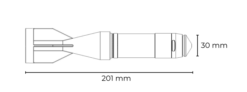 The VOG-17 High Explosive 30 mm Grenade is a conventional ordnance item that has been adapted for use as an Unmanned Aircraft System (UAS) dropped munition. This grenade has been modified for use as a drone-dropped bomb by disassembling the fuze and installing an improvised plunger assembly. A 3D-printed tail has also been added to ensure that the munition falls in a nose-down attitude after release from a UAS.